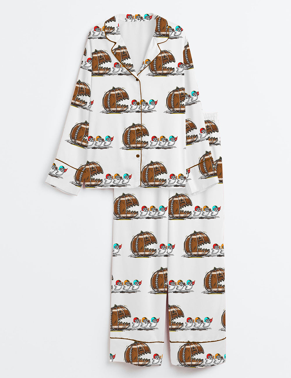 Women’s Retro Halloween Pumpkin Football Touchdown Season Fall Football Chasing Ghost Long Sleeve Satin Pajama Set