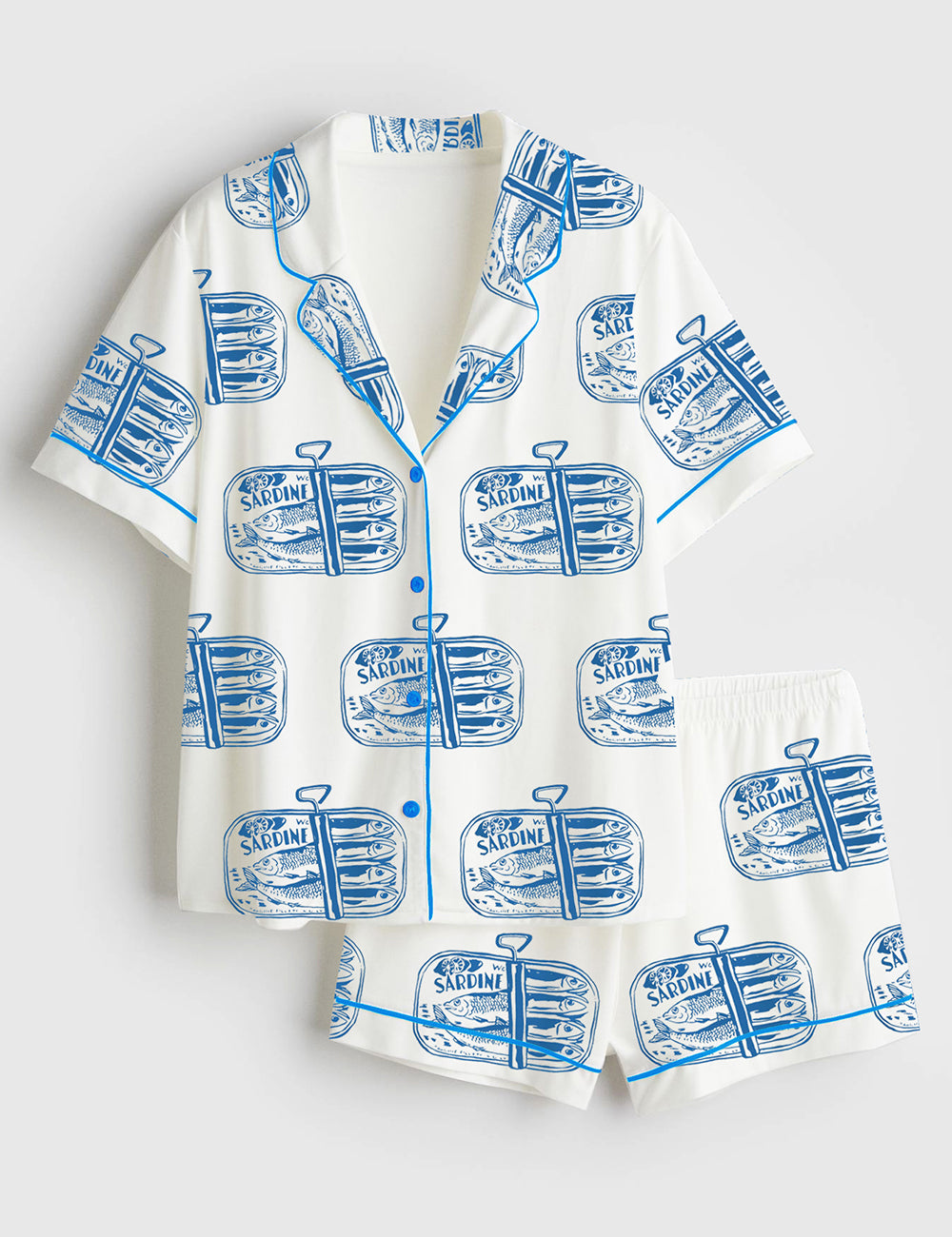 Women’s Sardines Tinned Fish Portugal Vintage Sardine Coastal Aesthetic Europe Travel Print Short Sleeve Satin Pajama Set