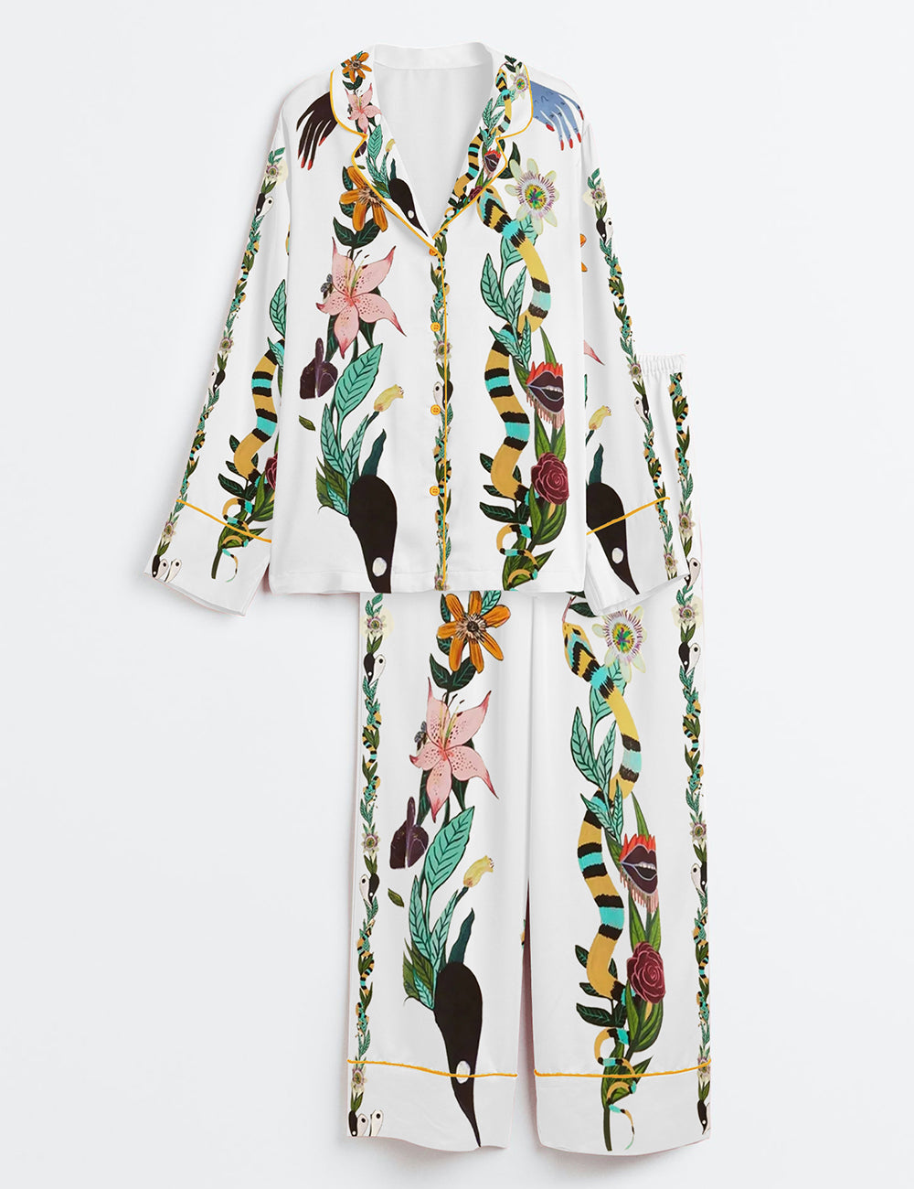 Women’s Special Flowers Hands Lips Long Sleeve Satin Pajama Set