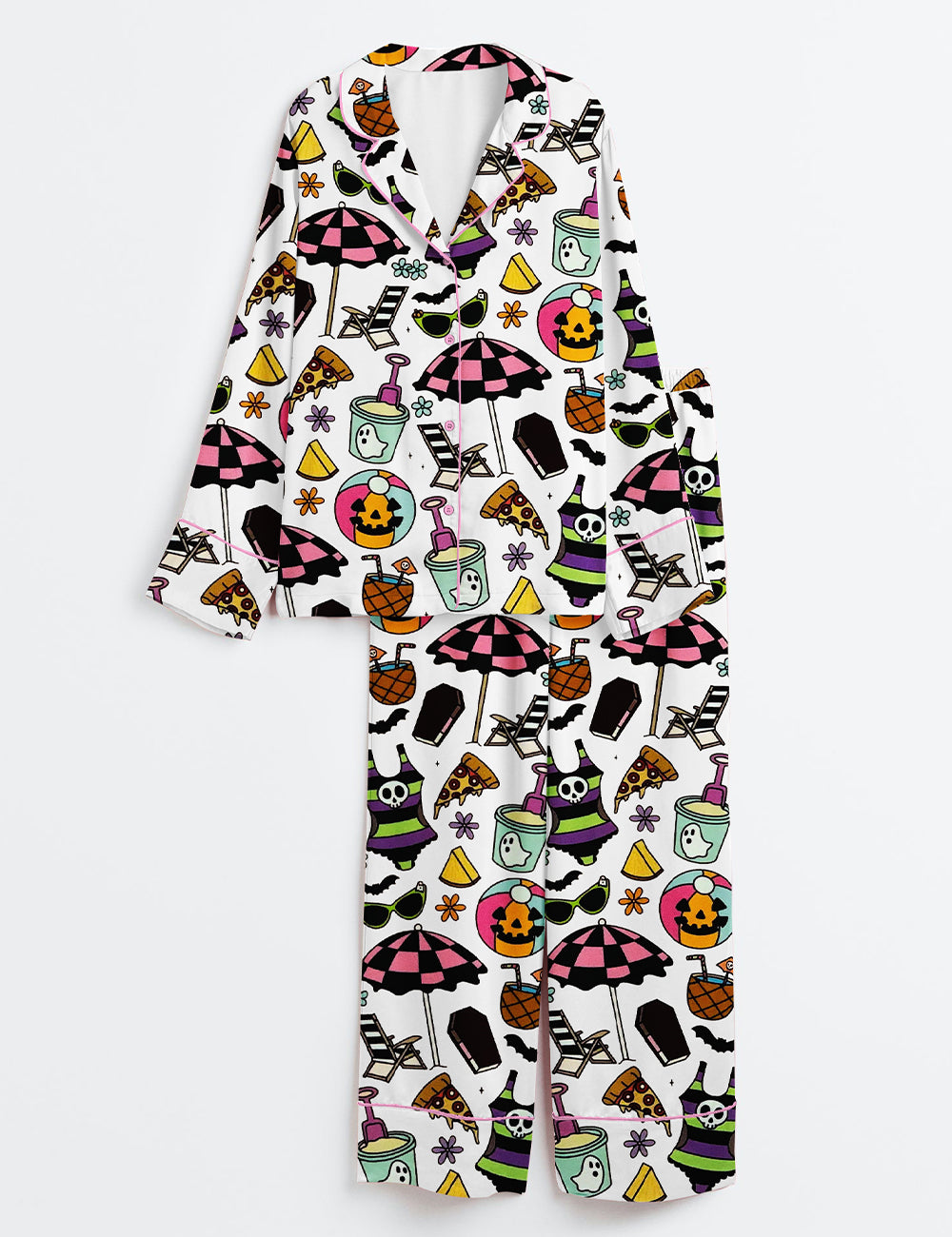 Women’s Summerween Halloween Ghost Slasher Scary Summer Sandy Ghouls Print Long Sleeve Satin Pajama Set