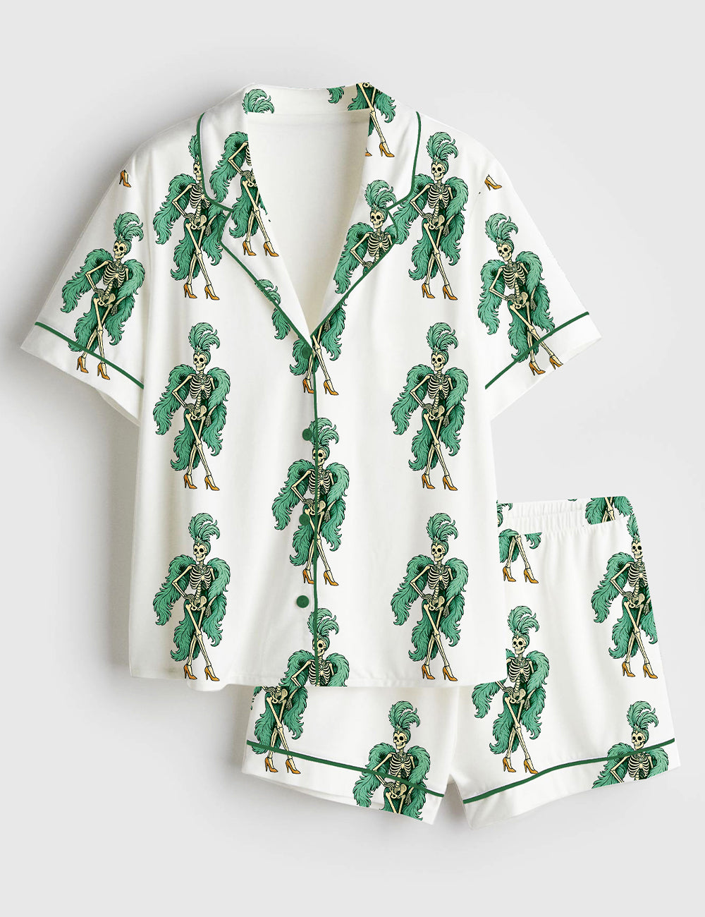 Women’s The Life Of A Showghoul Halloween Skeleton Showgirl Short Sleeve Satin Pajama Set