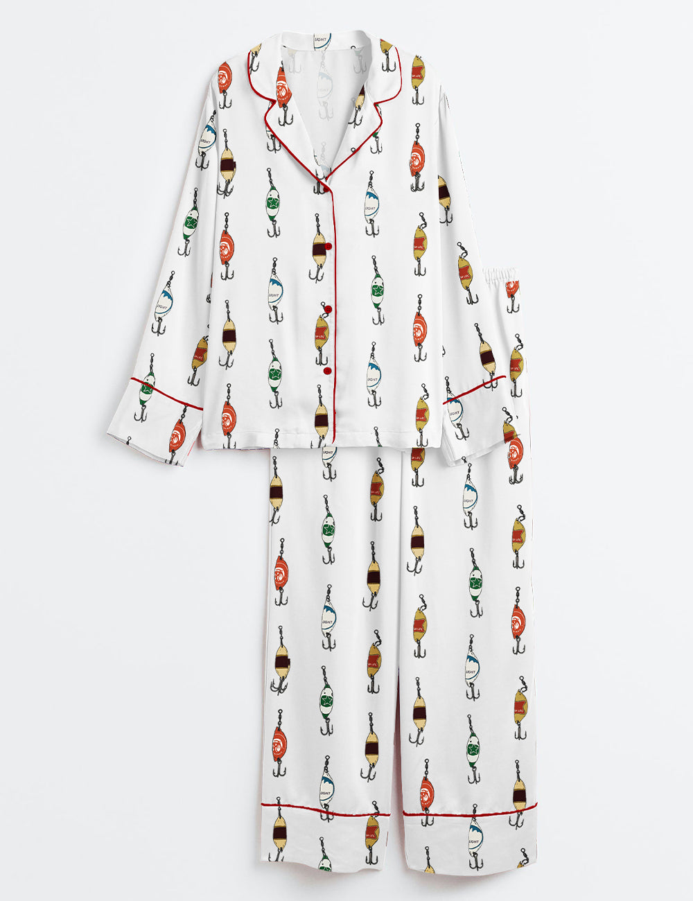 Women’s Tipsy Tackle Beer Fishing Vintage Funny Lure Summer Outdoor Lake Life Long Sleeve Satin Pajama Set