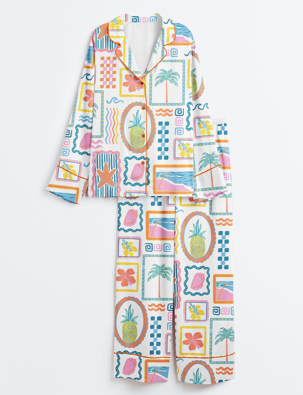 Women’s Trendy Beach Patchwork Summer Seashells Girly Summer Print Long Sleeve Satin Pajama Set
