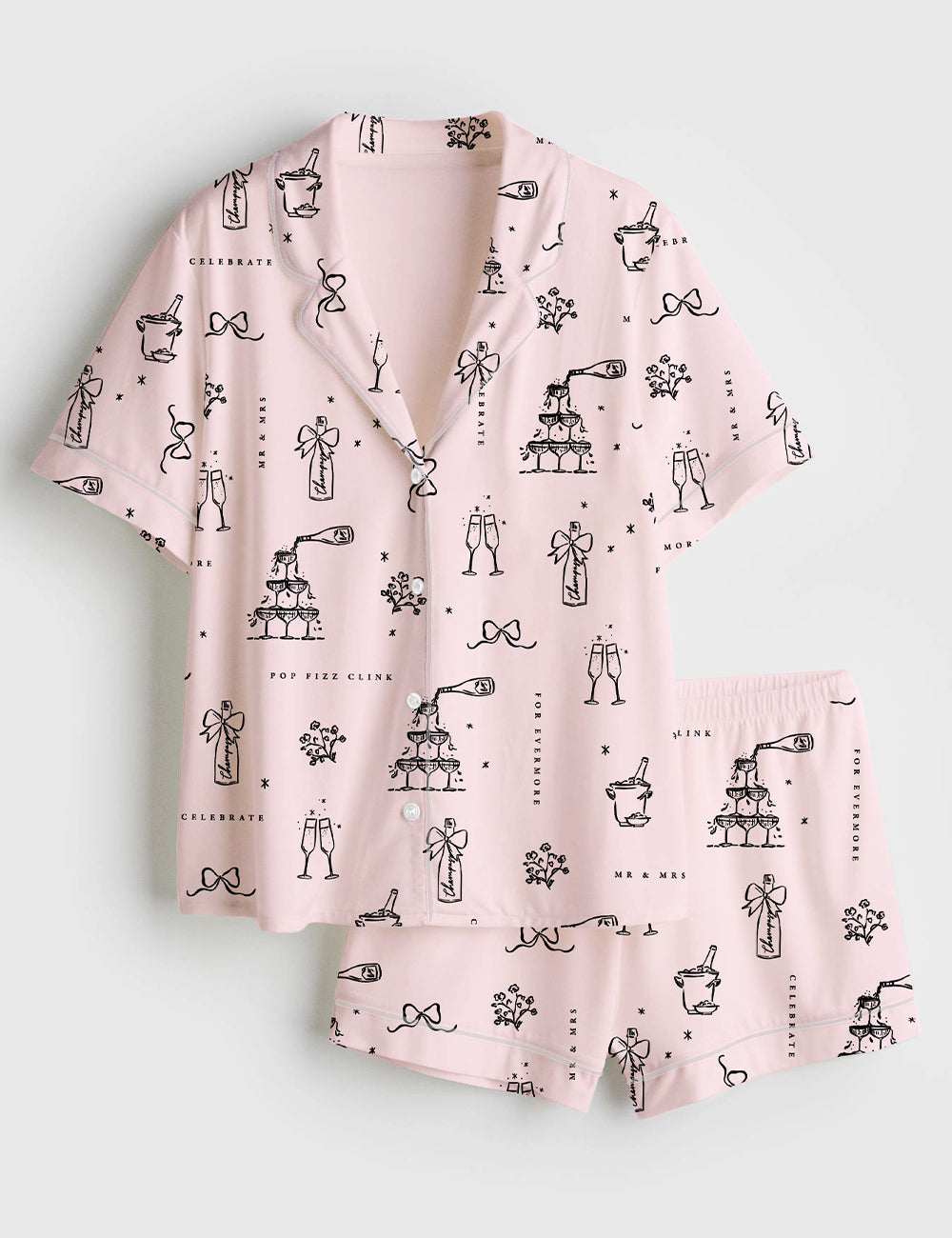 Women’s Wedding Bridal And Champagne Short Sleeve Satin Pajama Set