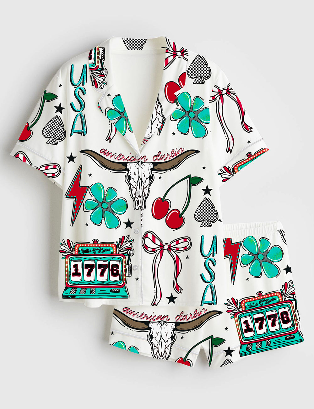 Women’s Western 4th Of July Independence Day America Checkers Coquette Patriotic Print Short Sleeve Satin Pajama Set