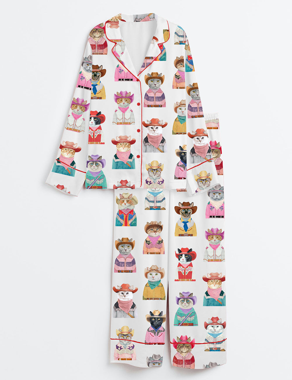 Women’s Western Cowboy Cats Cat Lovers Long Sleeve Satin Pajama Set
