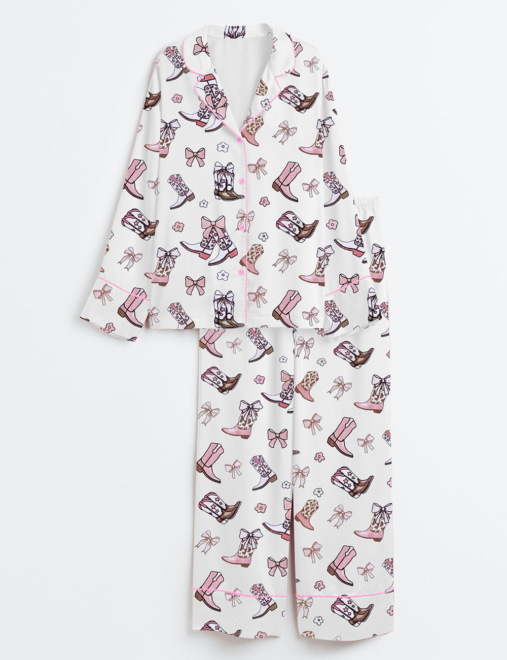Women’s White And Pink Bows Western Cowboy Boots Coquette Cowgirls Bows Print Long Sleeve Satin Pajama Set