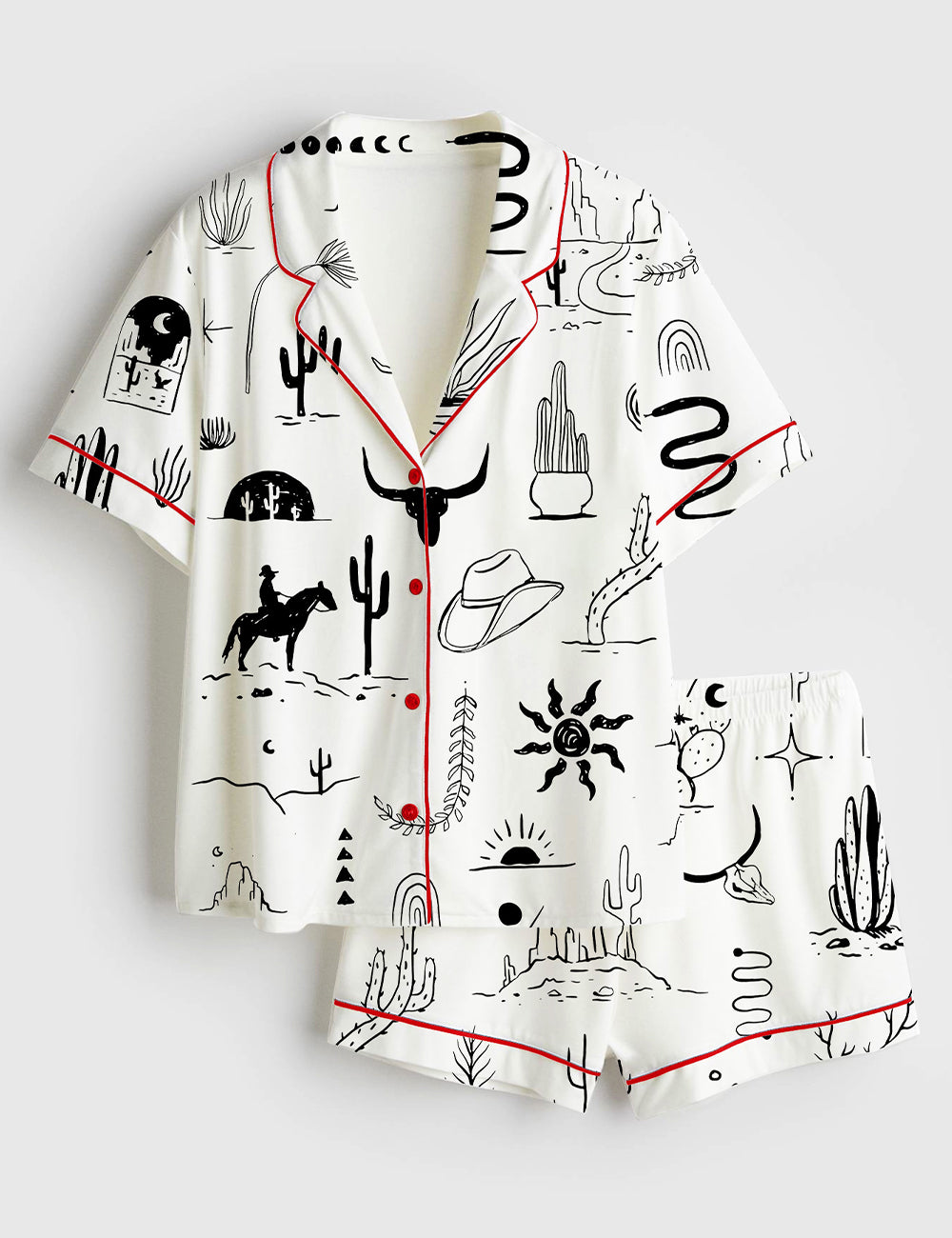 Women’s Wild Western Outdoors Adventure Silhouette Cowboy Cactus Mountain Snake Hand Moon Sun Print Short Sleeve Satin Pajama Set
