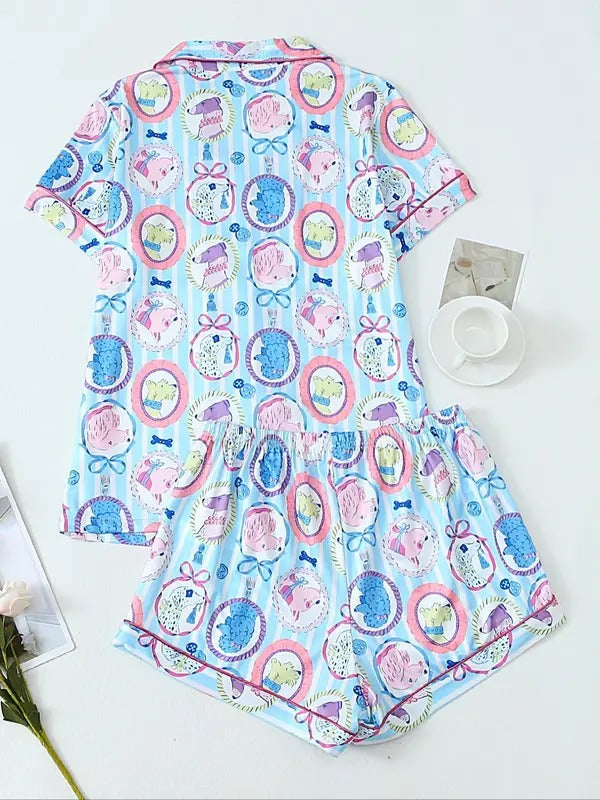 Women's All Over Print Lapel Neck Pajama Two-Piece Set, Casual Comfy Short Sleeve Top & Shorts Pajama Set, Ladies Sleepwear for All Seasons, Loungewear
