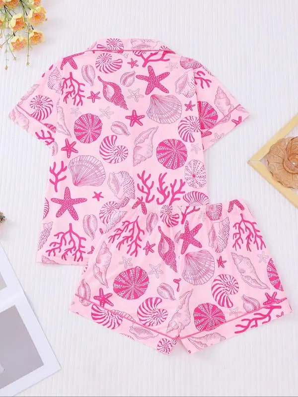 Women's All Over Shell Print Short Sleeve Pajama Two-piece Set, Elegant Casual Comfy Button Front Lapel Neck Top & Shorts Set, Ladies Sleepwear for All Seasons1