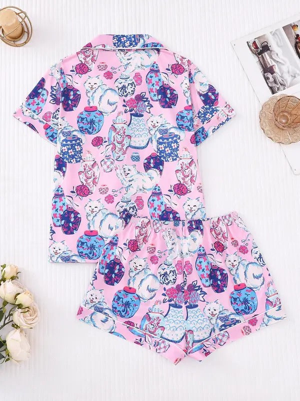 Women's Cartoon Cat Print Lapel Neck Short Sleeve Shirt & Elastic Waist Shorts Pajama Two-Piece Set, Casual Comfy Button Front Chest Pocket Design Top & Shorts PJ Set, Ladies Sleepwear for All Seasons