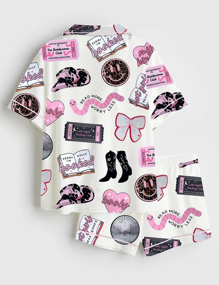 Women's Disco Ball Cherries Smiley Bookworm Long Sleeve Satin Pajama Set