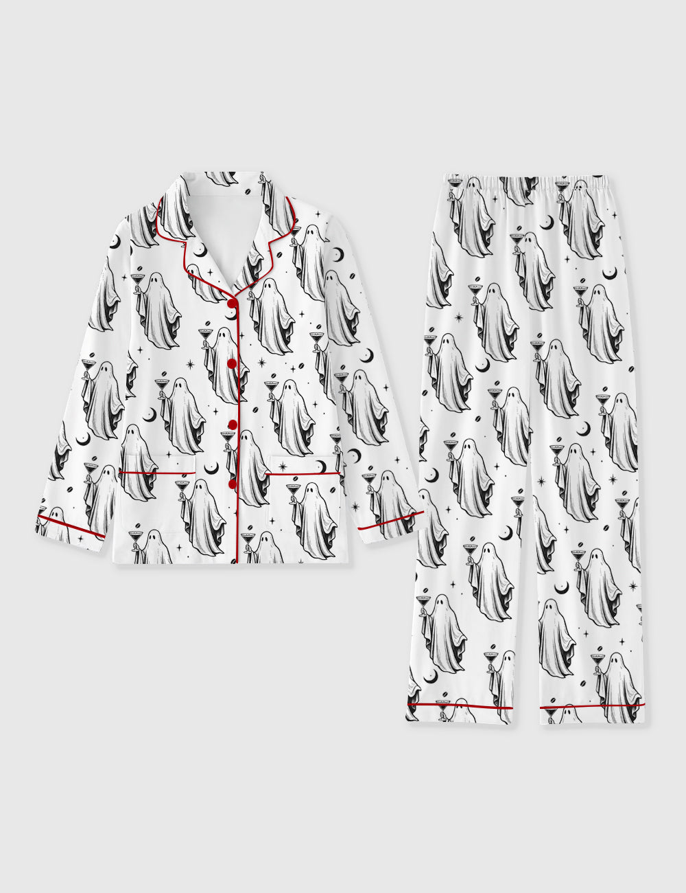Women's Halloween Ghost Cocktail Espresso Martini Long Sleeve Pocket Cotton Pajama Set