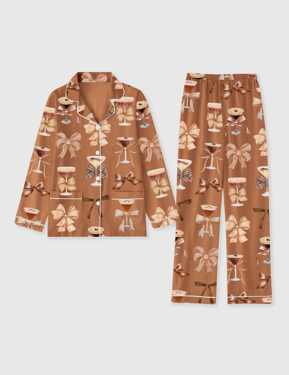 Women's Martini Espresso Cocktail Preppy Girls Night Trendy Bow Long Sleeve Pocket Cotton Pajama Set