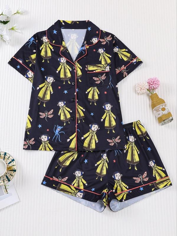 Women's Monkey Print Pajama Set, Short Sleeve Button Front Top & Elastic Shorts, Casual Home Wear, Comfortable Sleepwear