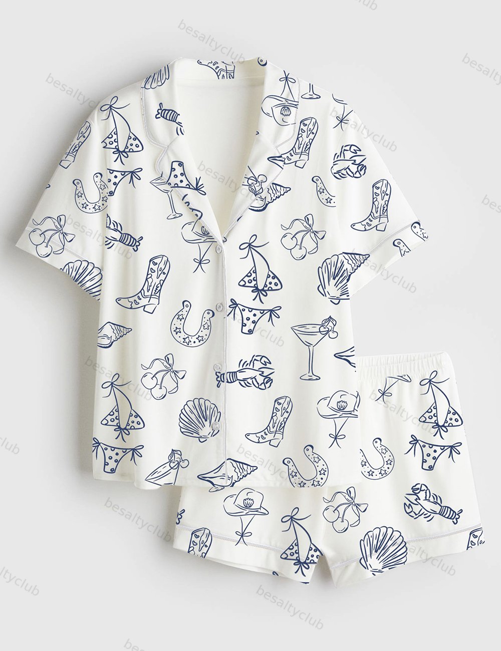 Women's Vintage Coastal Cowgirl Retro Western Seaside Summer Short Sleeve Satin Pajama Set