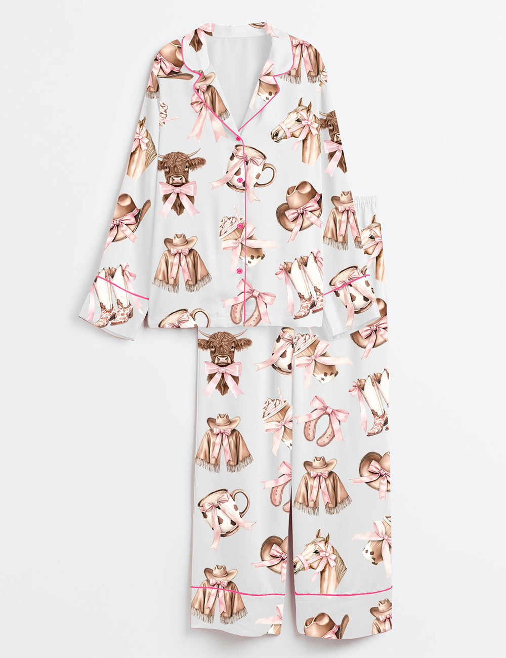 Women's Western Cowgirl Highland Cow Long Sleeve Satin Pajama Set