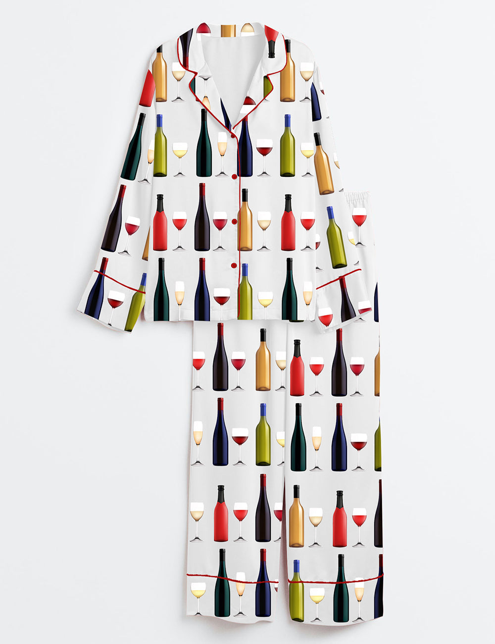 Women's Wine Bottle Long Sleeve Satin Pajama Set