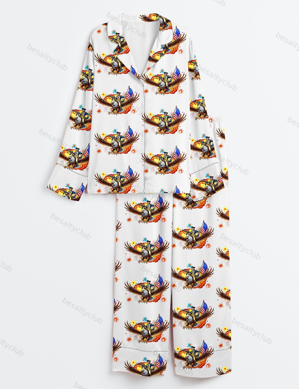 Wtf Is A Kilometer Eagle Funny 4th Of July Founding Father USA Independence Day Print Long Sleeve Satin Pajama Set